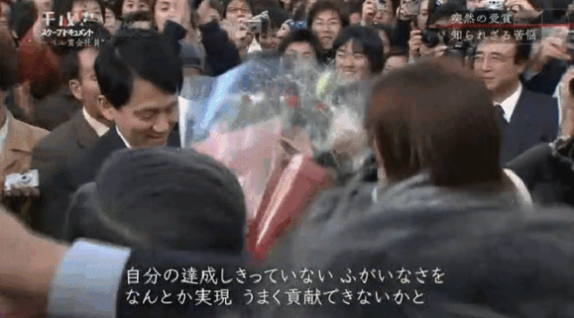 大批想搶占先機的記者,一下就把製作所圍得水泄不通。臨時被抓住採訪的田中,還穿著做實驗用的藍色工裝。